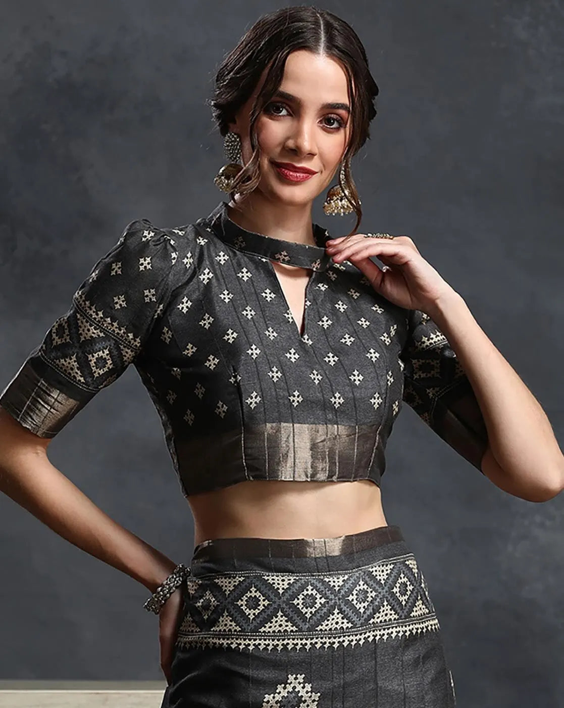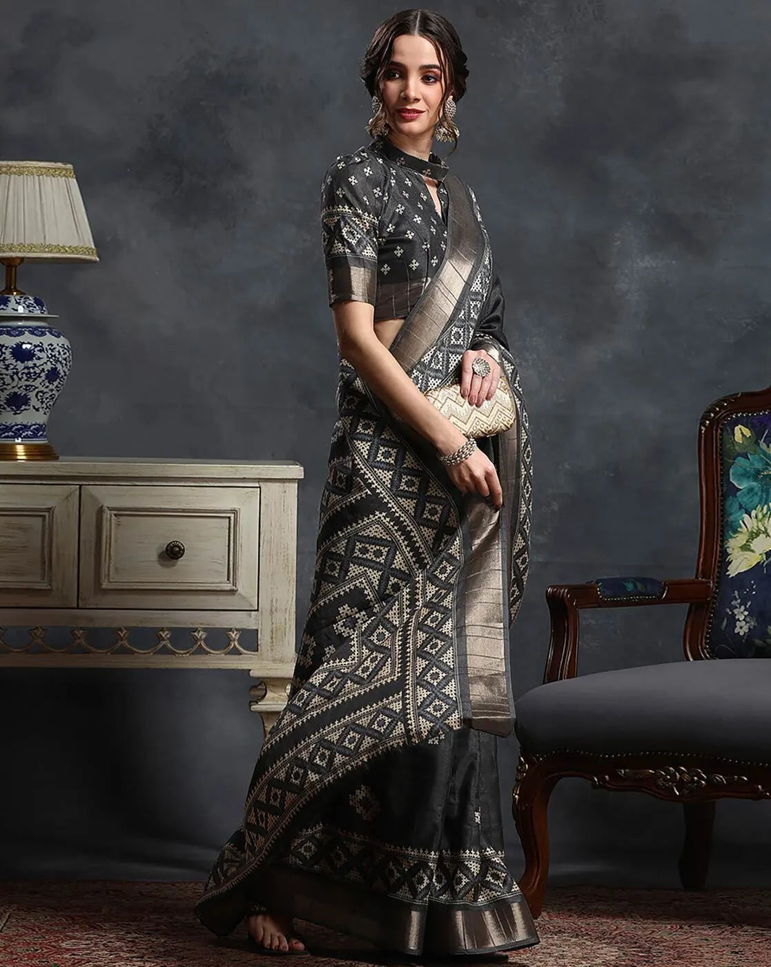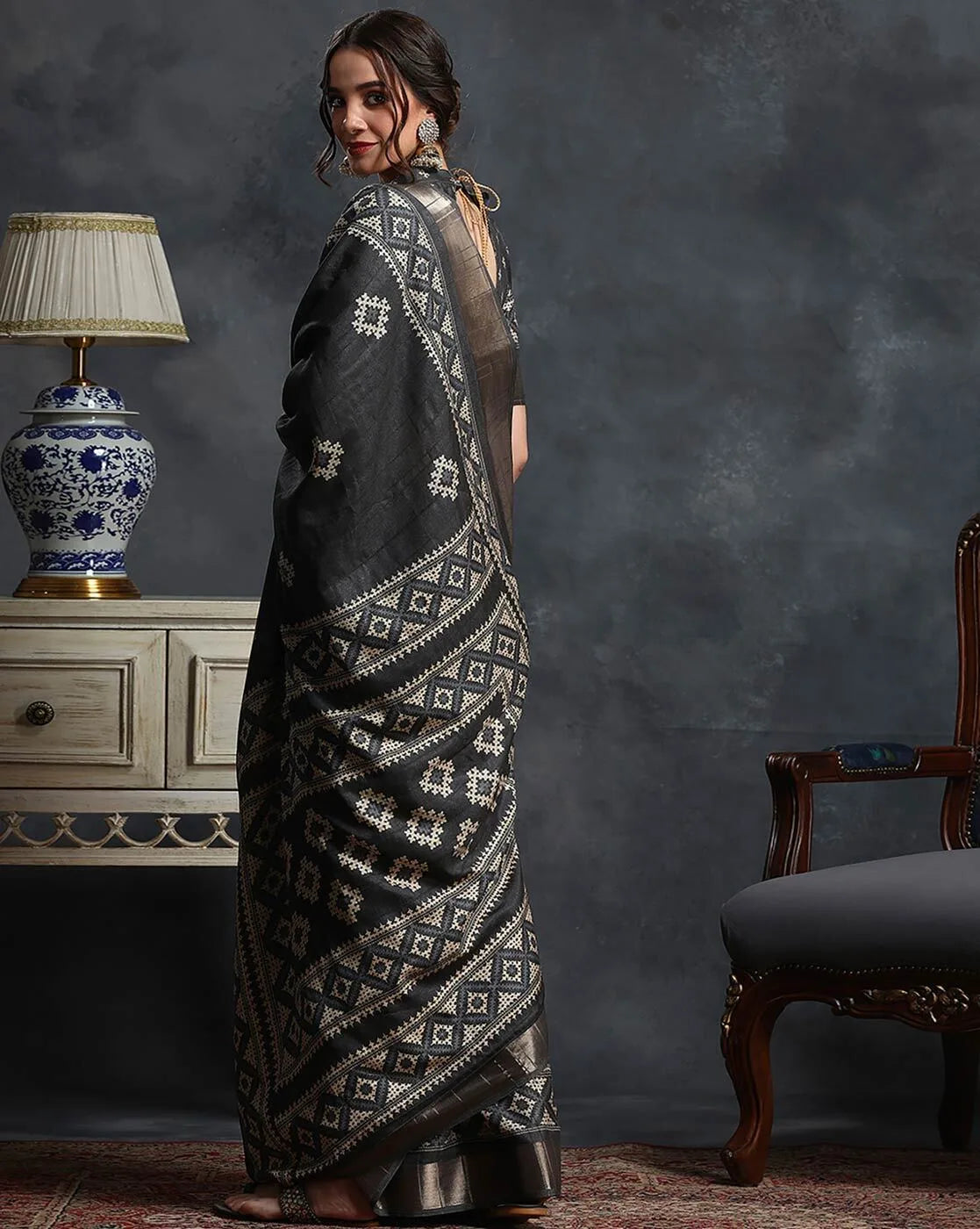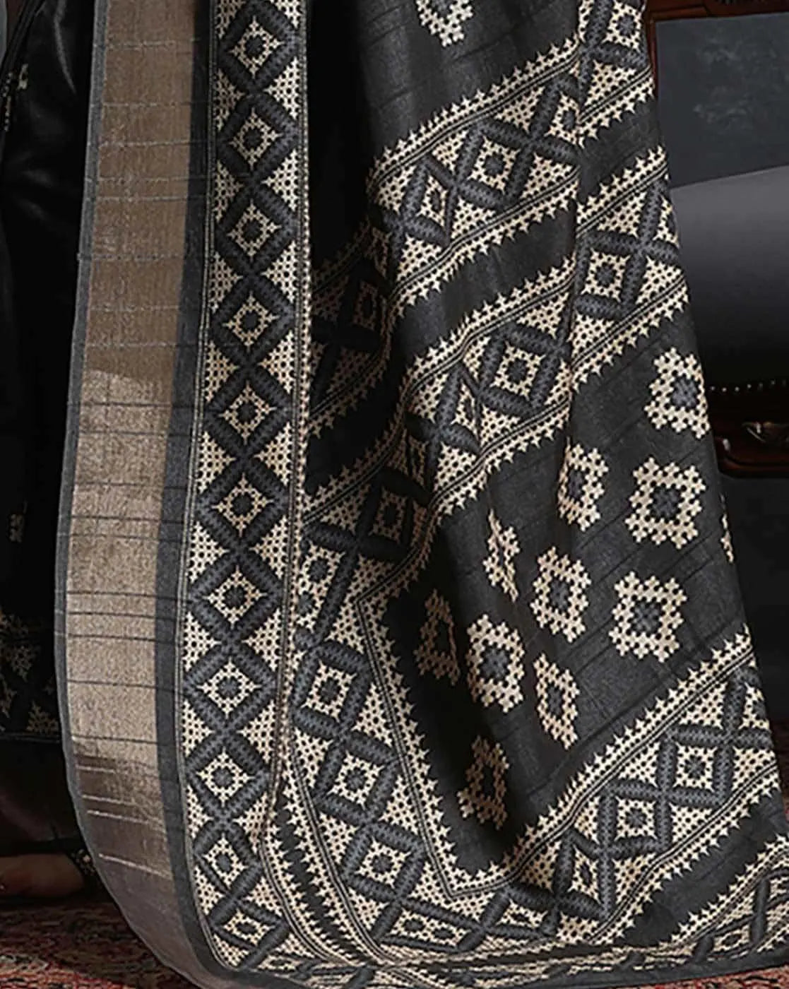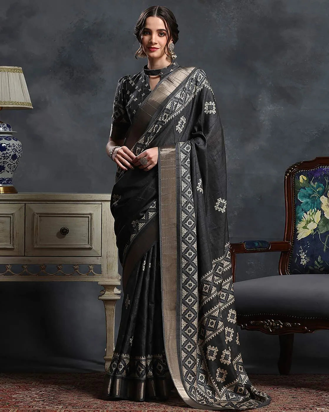 Black & White Ethnic Printed Zari Sungudi Saree