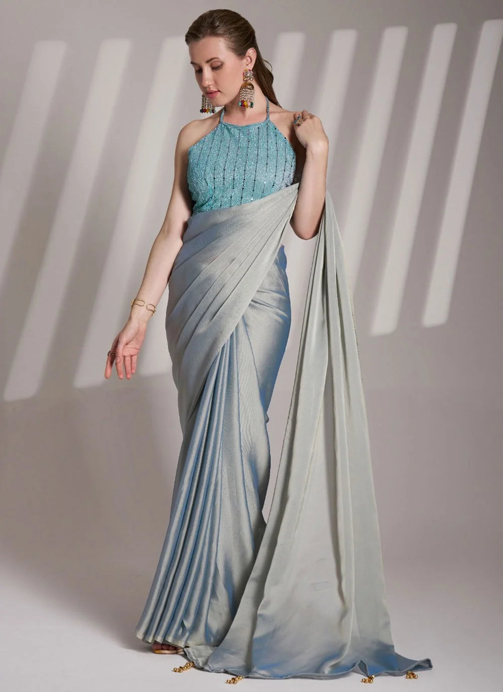 Stylish Silver Gray Satin Silk Party Saree